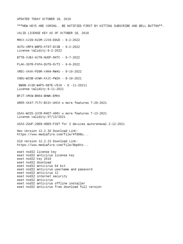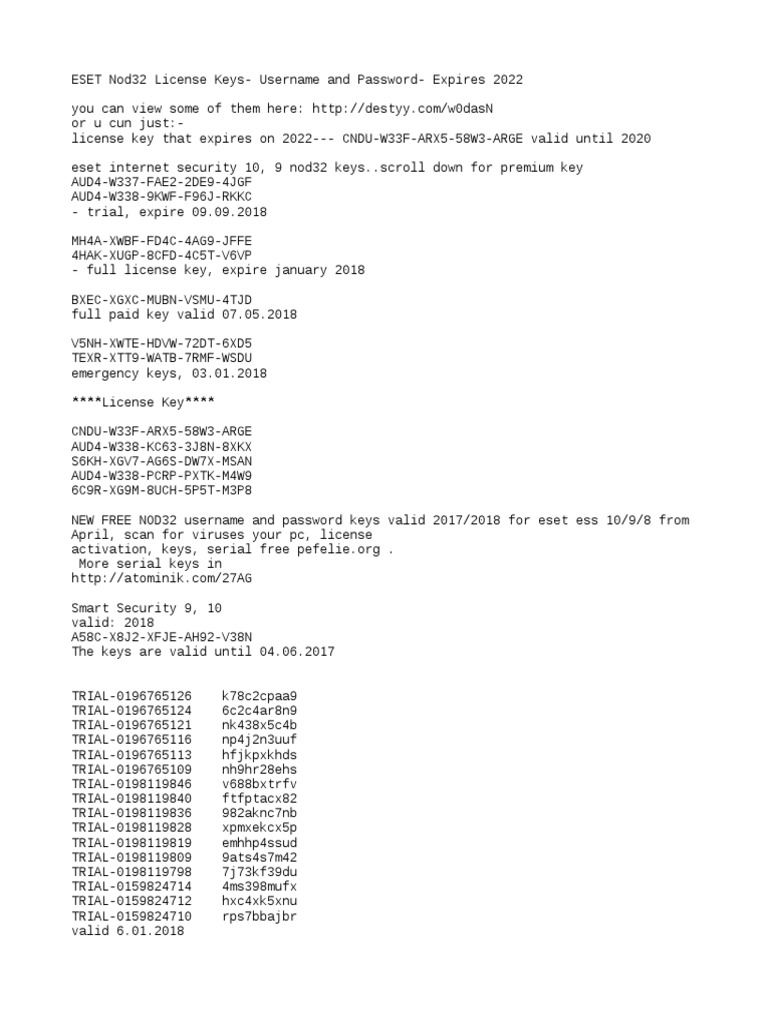 ESET nod32 keys | 30 days trial license for free Free ESET NOD32 keys valid until 2023-Jan-01. Trial License activation key for 30 days for ESET NOD32 Antivirus, ESET NOD32 Internet Security, ESET NOD32 ...