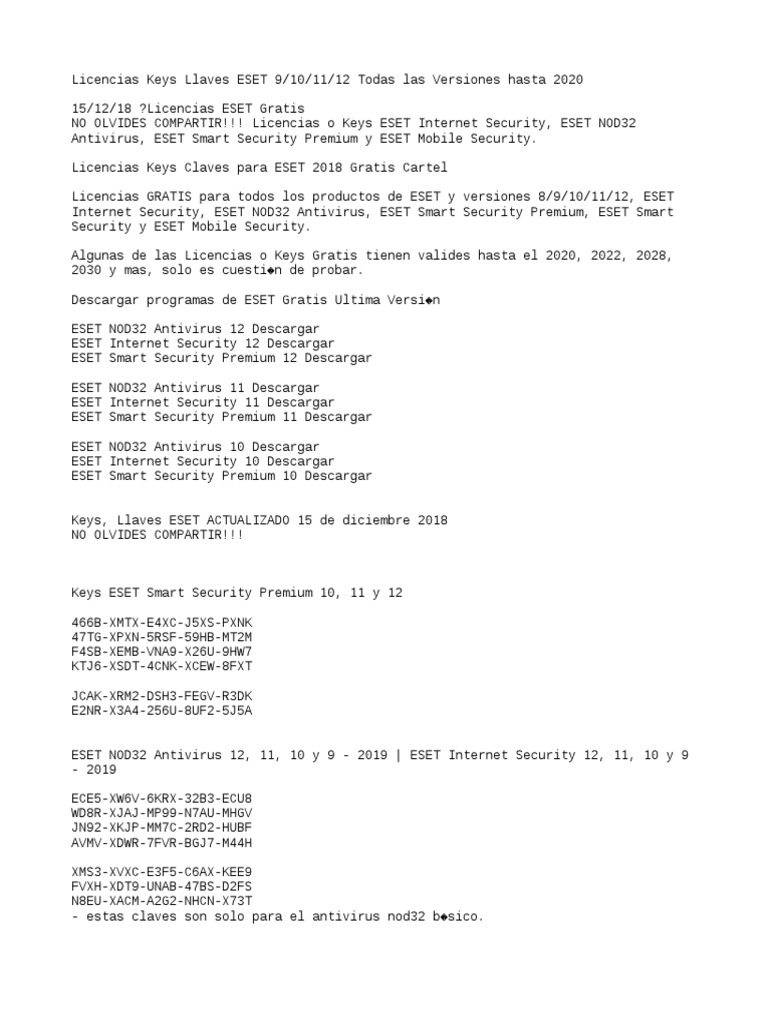 ESET Nod32 Claves, licencias y seriales actualizada 2020-2022 ESET Nod32 Claves, licencias y seriales actualizada 2020-2022. Estas son las claves de licencia para ESET NOD32 ANTIVIRUS versión 12.2.30.0 RKUG-XG9C-XTEB-B8TV-WT7P D7TA-XJPV-PPDV-4CT. Views 4,436 Downloads 47 File size 19KB.