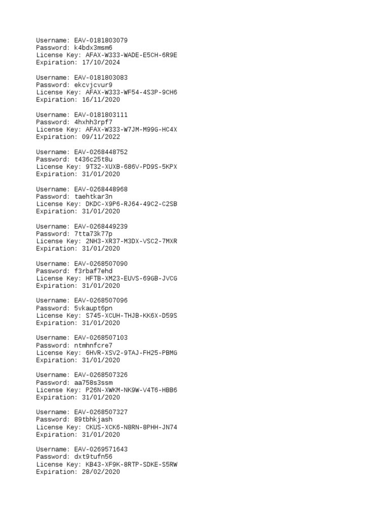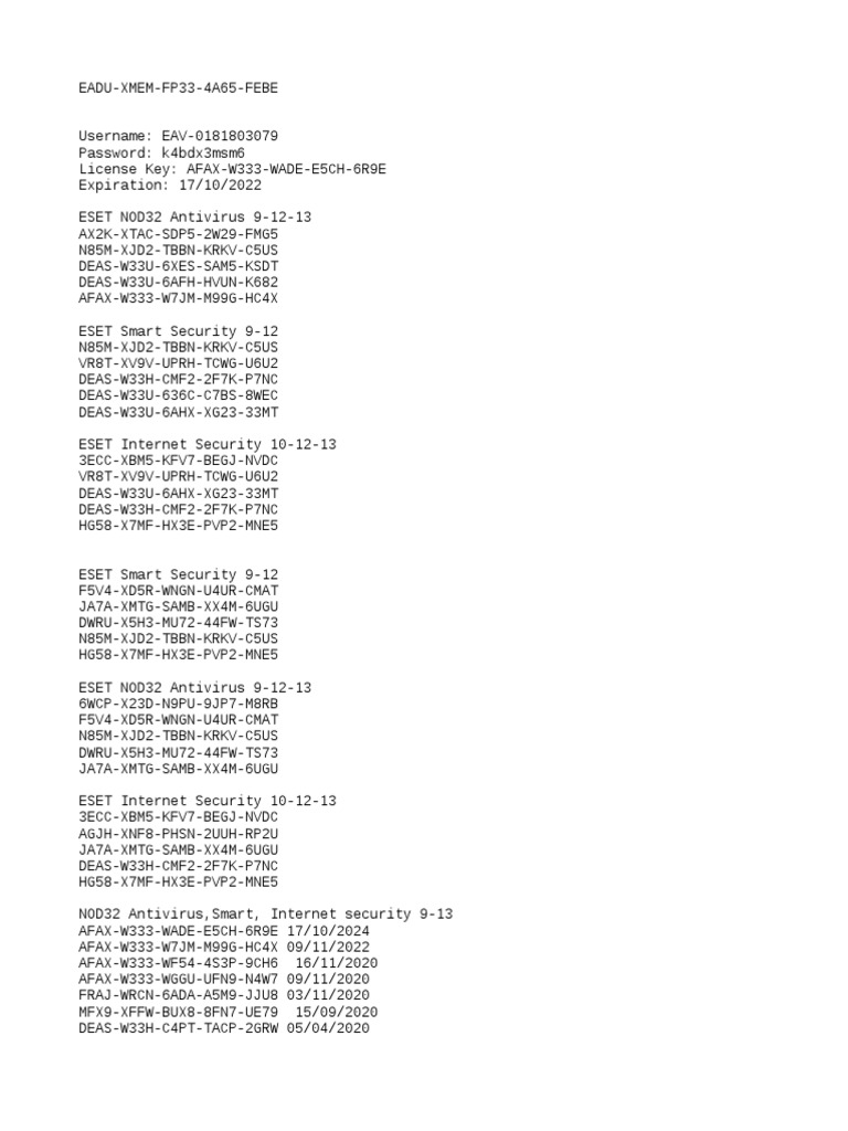 Eset NOD32 antivirus license key 2023 ESET Internet Security until 2024 ... Eset Nod32 License Key 2023 Antivirus Eset Key Full Full Active Key 2023 UpdateDownload link: : 1234📢limited download)📢🔔... ESET Nod32 Claves, Licencias y Seriales Actualizada 2020-2022 Original Title: ESET Nod32 Claves, licencias y seriales actualizada 2020-2022 Uploaded by Arihagne Sophia Pringles Copyright: © All Rights Reserved Flag for inappropriate content of 3 Estas son las claves de licencia para ESET NOD32 ANTIVIRUS versión 12.2.30. RKUG-XG9C-XTEB-B8TV-WT7P D7TA-XJPV-PPDV-4CTH-H9VX AP9R-X782-V2GG-VVJH-XT2F ESET NOD32 Antivirus License Key Full Version Latest Update 2022 - Scribd ESET NOD32 Antivirus License Key Full Version Latest Update 2022_2023 - Free download as Text File (.txt), PDF File (.pdf) or read online for free. ... LICENCIAS_NOD32_MARZO 2020. SheskaVivancoGomez. Licencias.docx. Licencias.docx. Edi Obrayan. Blocked Keys.txt. Eset nod32 antivirus descargar licencia gratis - rankw.ru Главная » Рейтинг сайтов » Eset nod32 antivirus descargar licencia gratis Eset nod32 antivirus descargar licencia gratis — Рейтинг сайтов по тематике