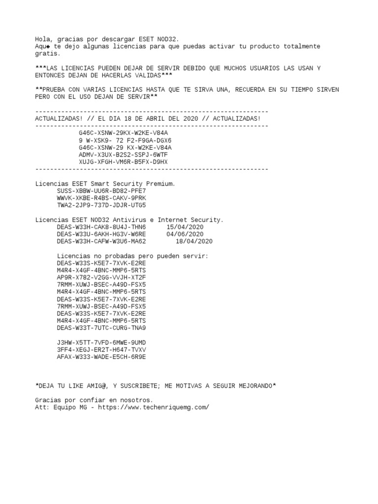 Licencias ESET NOD32 actualizadas [ABRIL 2023] Claves de licencia ESET NOD32 8 - 15 actualizadas 2023 - 2024 gratis scrapywar 1 de enero de 2022Última Actualización: 21 de marzo de 2023 En este sitio siempre encontraras claves de licencias validas para todos los productos de ESET como NOD32 Antivirus para MARZO y todo el 2023 - 2024.